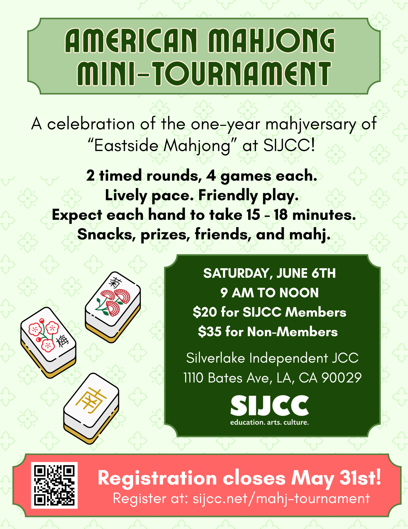 Join us at SIJCC for a casual night of American Mahjong—a fun mix of strategy, luck, and community. All skill levels are welcome, and if you have your own set, feel free to bring it so we can keep more tables going. Come build walls, swap stories, and play a few lively rounds with us!